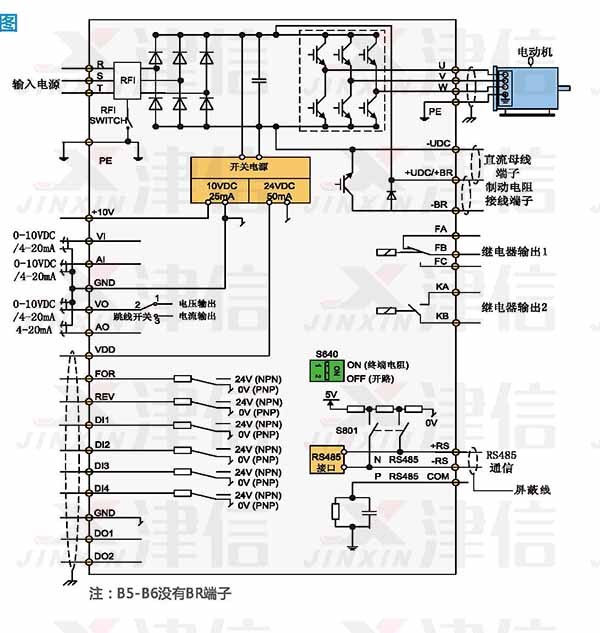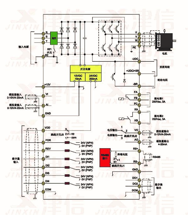 海利普變頻器主要由整流、濾波、逆變、驅動單元、制動單元、檢測單元微處理單元等組成。采用交-直-交工作原理,首先將三相交流電經整流模塊變換成直流,再進行濾波后,通過IGBT等其它電力電子器件逆變成頻率和電壓均可變的三相交流電供電機使用。同時,通過IGBT的開斷調整輸出電源的頻率和電壓,從而達到調速、節能的作用。以下是海利普各系列變頻器的接線示意圖。