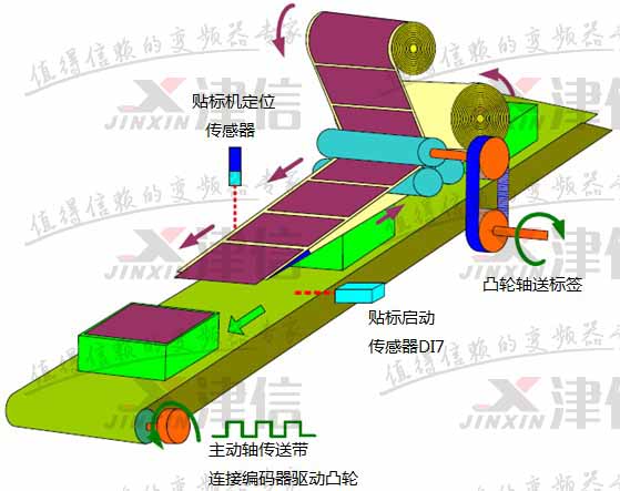 凸輪軸接收來自主軸的脈沖信號,依主軸節(jié)奏進(jìn)行貼標(biāo)動作,傳送標(biāo)簽時需很準(zhǔn)確平穩(wěn),在粘貼標(biāo)簽時,必須要能穩(wěn)定控制運(yùn)行速度與主軸同步,否則標(biāo)簽貼起來會不平順。