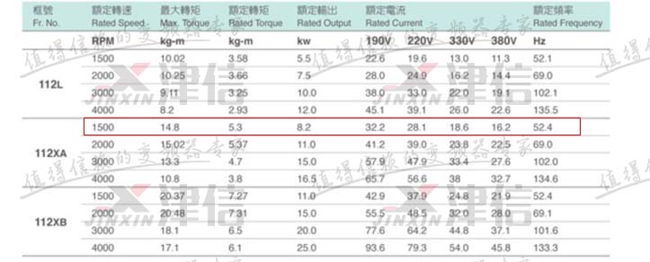 從FUKUTA異步伺服電機樣本中選出滿足條件的電機:SF-112XA 1500rpm/8.2kW,額定轉矩5.3kgm,大于40Nm/0.85(減速機效率)。電機380VAC時額定電流16.2A。